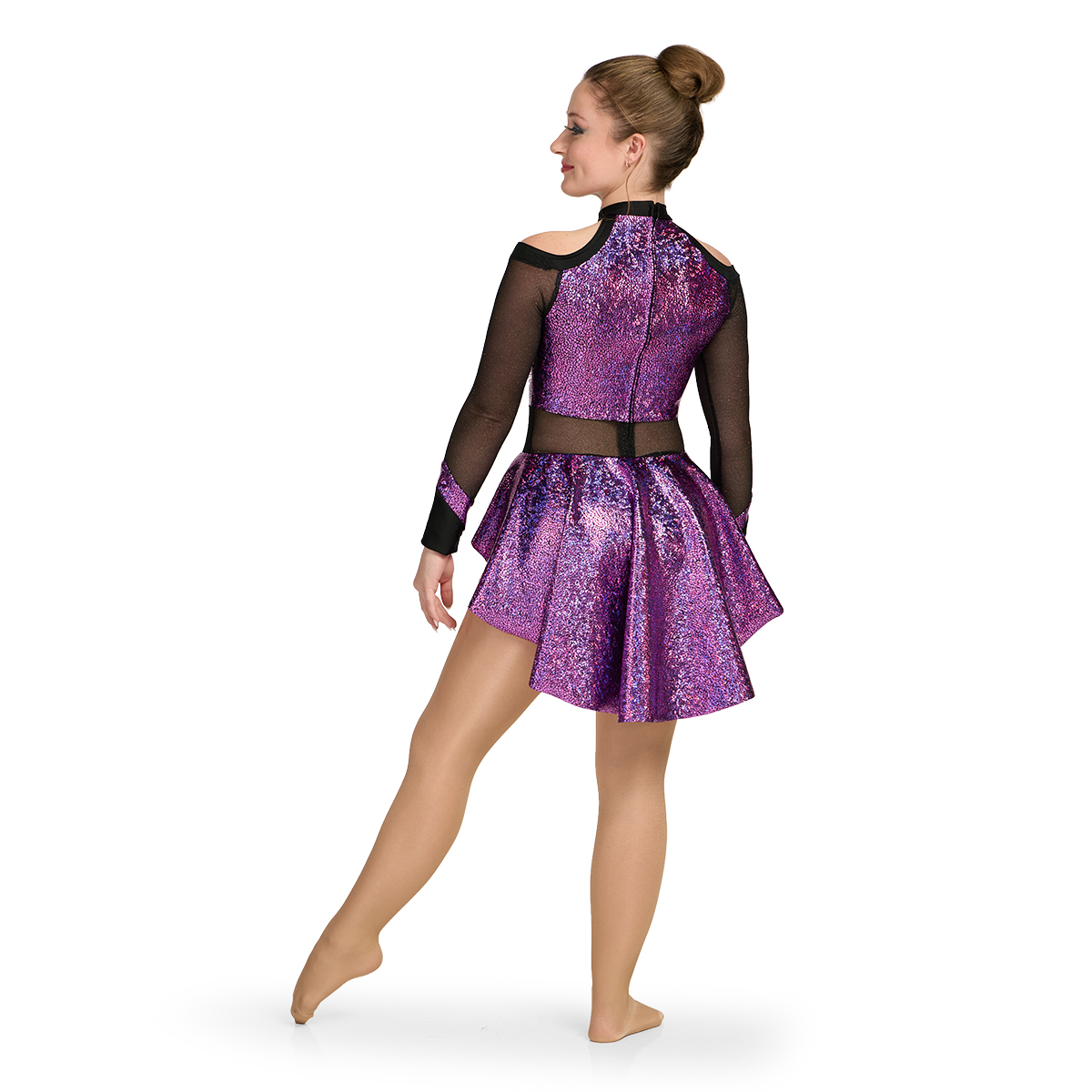 Long Sleeve Leotard with a Cascading Skirt, Mock Turtle Neck, and Shoulder Cutouts, Zippered Back Entry
