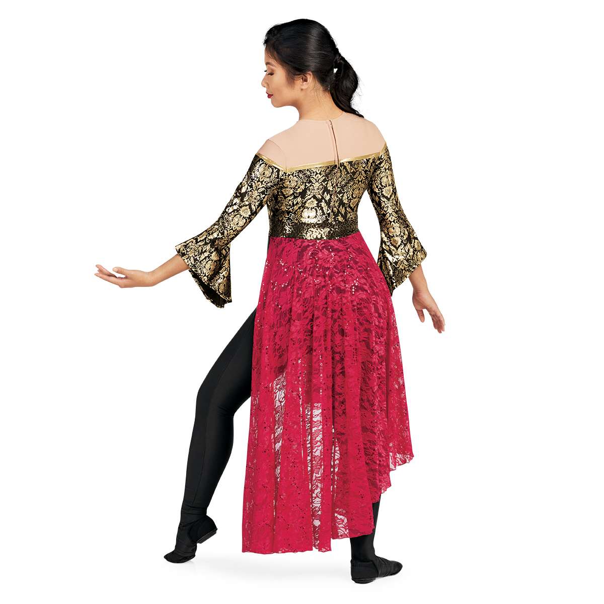 Skirted Legging Unitard with Mock Sweetheart Neckline and Bell Sleeves, Zippered Back Entry
