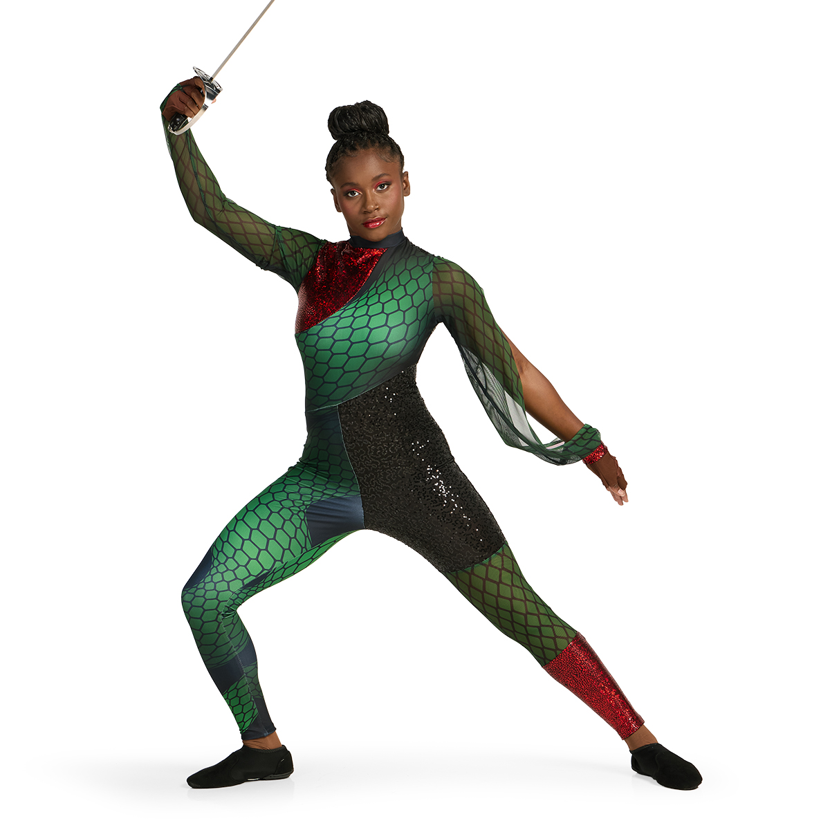 Band Shoppe’s custom color guard uniforms are designed and sewn in the USA with performance in mind. From vibrant 4-way stretch spandex to eye-catching sequins, metallics, and mesh, our fabrics are chosen to move beautifully under stadium lights or or center stage. You can customize any look in our collection with your choice of colors and materials, or start from scratch and design your own color guard uniform. Whether you’re preparing for a field show, winter guard, or WGI competition, our team is here to help you create a look that fits your show and your team perfectly.