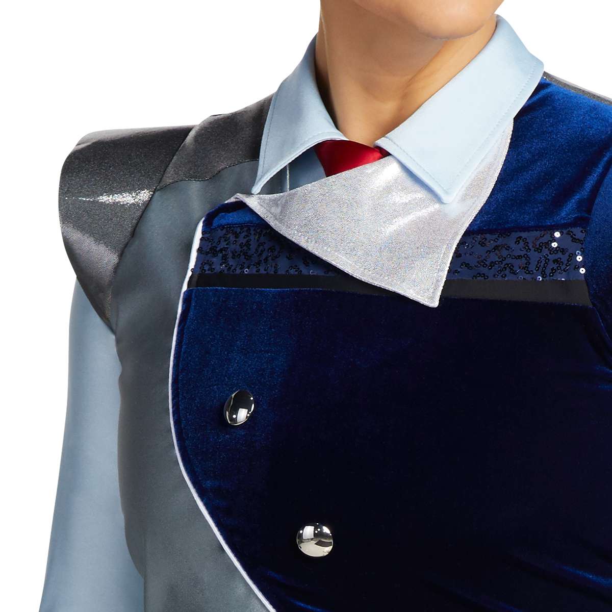 Colors: Titanium Satin Spandex, Stone and Black Matte Spandex, Royal Plush Velvet, Gunmetal and Silver Mystic Jewels, Navy Micro Sequin
